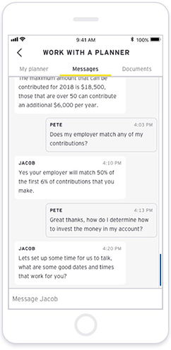 Along with a collection of proven tools and information to better equip you for your financial future, EY Navigate brings you the proven experience of a dedicated financial planner to help you achieve your goals. Once you begin using the service, you will be paired with an experienced planner who will be available to you via phone or messaging. This is a proven professional who can offer unbiased education and guidance as it pertains specifically to you and your unique financial situation.